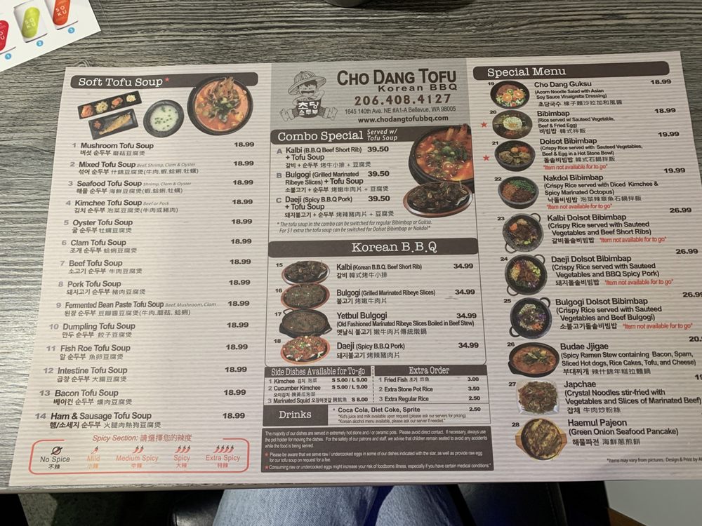 Introducing the menu at Cho Dang Tofu, a Korean restaurant in Bellevue, WA, known for its authentic and flavorful dishes. Customers rave about the efficiency of service, with fast wait times even on busy nights. The must-try items include the chicken thighs bulgogi with seafood tofu soup combo, hot stone bibimbap, and tofu soup. The banchan, barley tea, and LA Galbi are also highly recommended. The restaurant offers a range of amenities such as takeout, reservations, and wheelchair accessibility. Cho Dang Tofu provides a cozy ambiance with attentive staff, making it a great choice for Korean cuisine lovers. Don't miss out on the generous portions and reasonable prices at this popular spot.